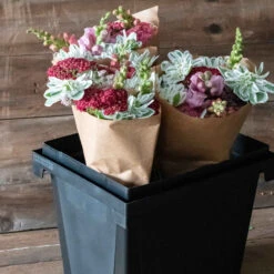 An all-in-one flower harvest, transport, and display system that provides optimal conditions for cut flowers on each leg of their journey. The main components of the Procona System are: 1) a plastic container that can be filled with water and flowers; 2) a cardboard collar for increasing height and protecting blooms during transport; 3) and a ventilated lid that provides a stable base for the next row of stacked containers. The small container footprint allows for high loading capacity, and the side and top ventilation allows all flowers to receive adequate air flow to stay fresher longer. Once flowers arrive at market, simply remove collars and lids for a beautiful display. A variety of sizes and collar heights in two Procona Series (Florida and Valencia) are available to accommodate different flower sizes and stem lengths. Procona containers can also be topped with lids to create professional, reusable vegetable CSA boxes.