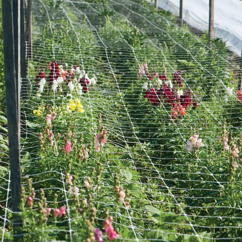 Horizontal trellis for supporting long stems in cut-flower cultivation.