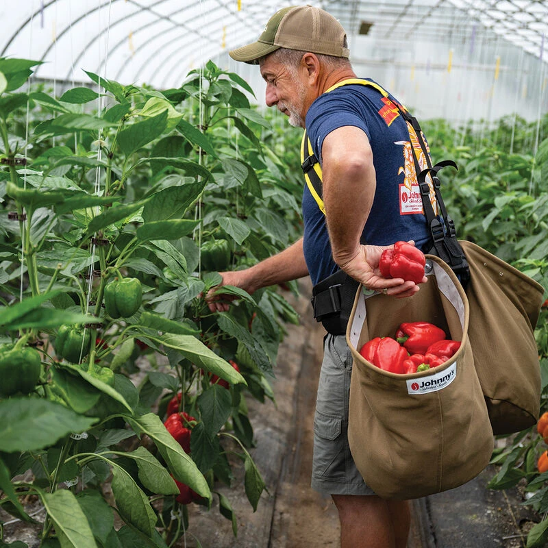 The highly adjustable padded harness distributes weight evenly across the shoulders freeing your hands to harvest and tend to plants. Each reinforced canvas bag holds approx. 6 gal. volume.