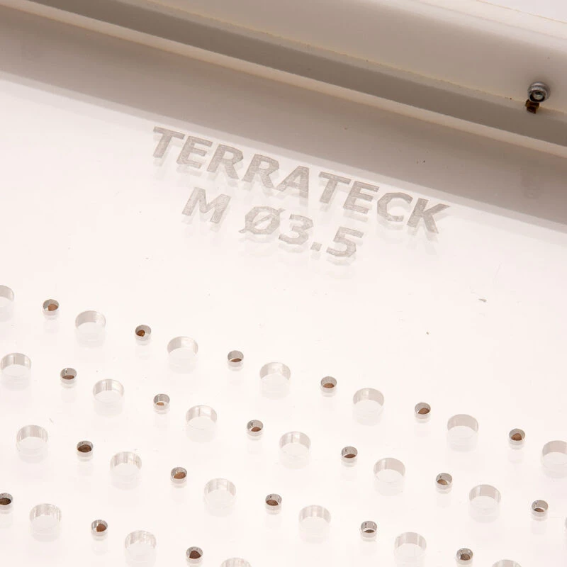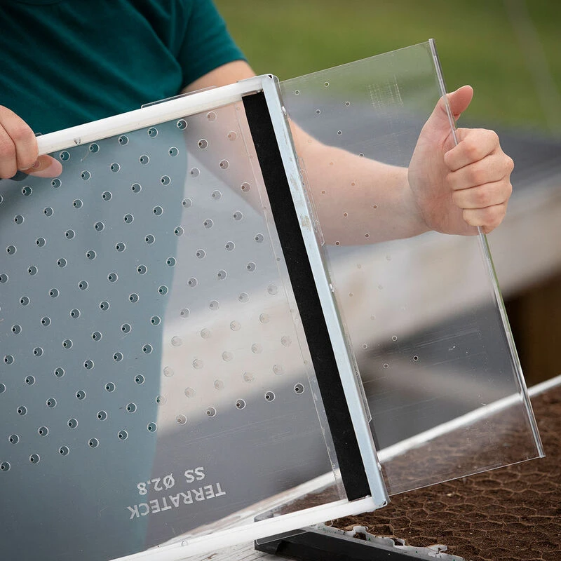 Paperpot drop seeder frame accepts interchangeable plate for desired seed size. Clear plexiglass for easy sowing in paperpot trays. Drops 264 seeds in one motion. Choose from five plate sizes. Plate required for use; sold separately.