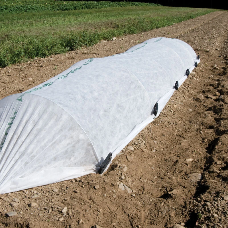 Convenient, lightweight anchors make it easy to remove row covers and access crops. 8″ (20 cm) long, barbed prong holds firmly in the ground, even in areas of strong wind, and small points pierce through fabrics to keep them taught. Place pegs at the base of hoop supports for best results: The long prong should be just outside the rolled row cover edge, with one point pinning the fabric against the soil. 6″ (15 cm) wide handle. 25 Count.